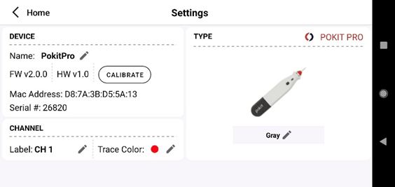 Range Tester requires at least FW Version 2.0.0. To check your firmware is up to date, navigate to the device settings page by selecting the gear icon in the top right of the connected Pokit Pro. If your device doesn’t have the latest firmware, a button will appear on the Settings page that says “Update Firmware”